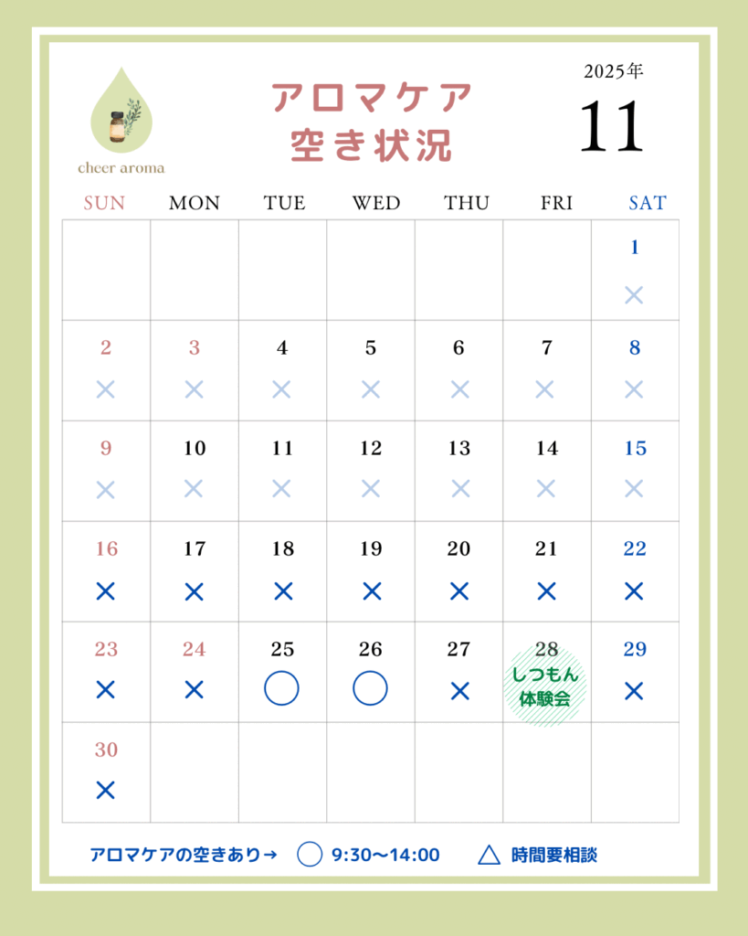 11月の空き枠(○=9:30–14:00/△=時間要相談)