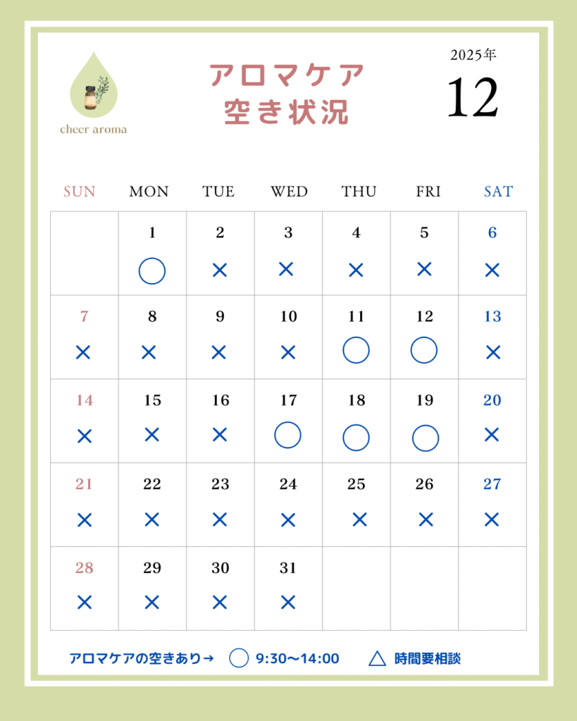 12月の空き枠(○=9:30–14:00/△=時間要相談)